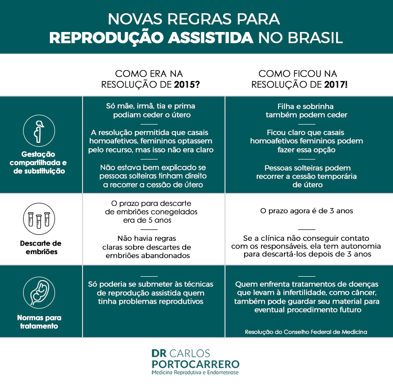 O Conselho Federal de Medicina (CFM) divulgou nesta quinta-feira (9) a atualização das normas para utilização das técnicas de reprodução assistida (RA) no Brasil. Por meio da Resolução CFM nº 2.168/2017, com publicação prevista no Diário Oficial da União ainda esta semana, a autarquia editou regras sobre temas como: descarte de embriões, gestação compartilhada e de substituição. Dentre as novidades, destaca-se a inclusão de questões sociais na avaliação médica para utilização de RA. Pacientes em tratamento oncológico também foram contemplados.
