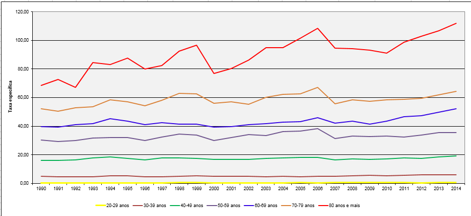Taxas de mortalidade por câncer de mama feminina, específicas por faixas etárias, por 100.000 mulheres. Brasil, 1990 – 2014